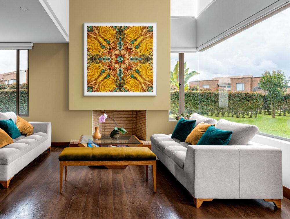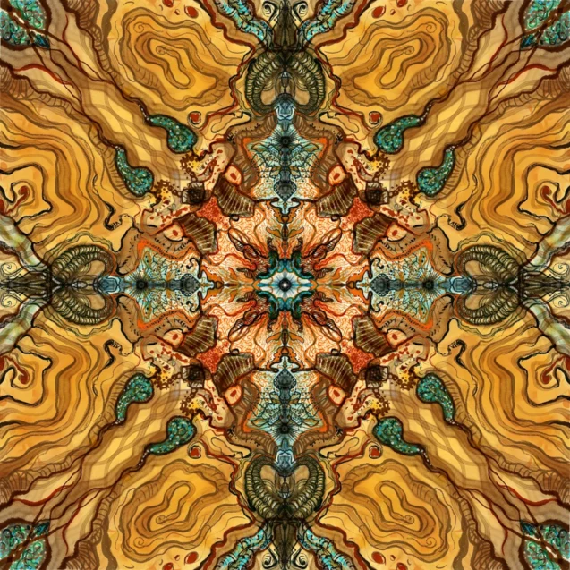 Light breaks through the dark soul. The diabolic is shattered. Gold creates new life in organic forms — fractal rivers of amber and sienna flowing toward a turquoise eye at the center of everything. This is breakthrough. This is the moment the long night ends. This is what resurrection actually looks like.